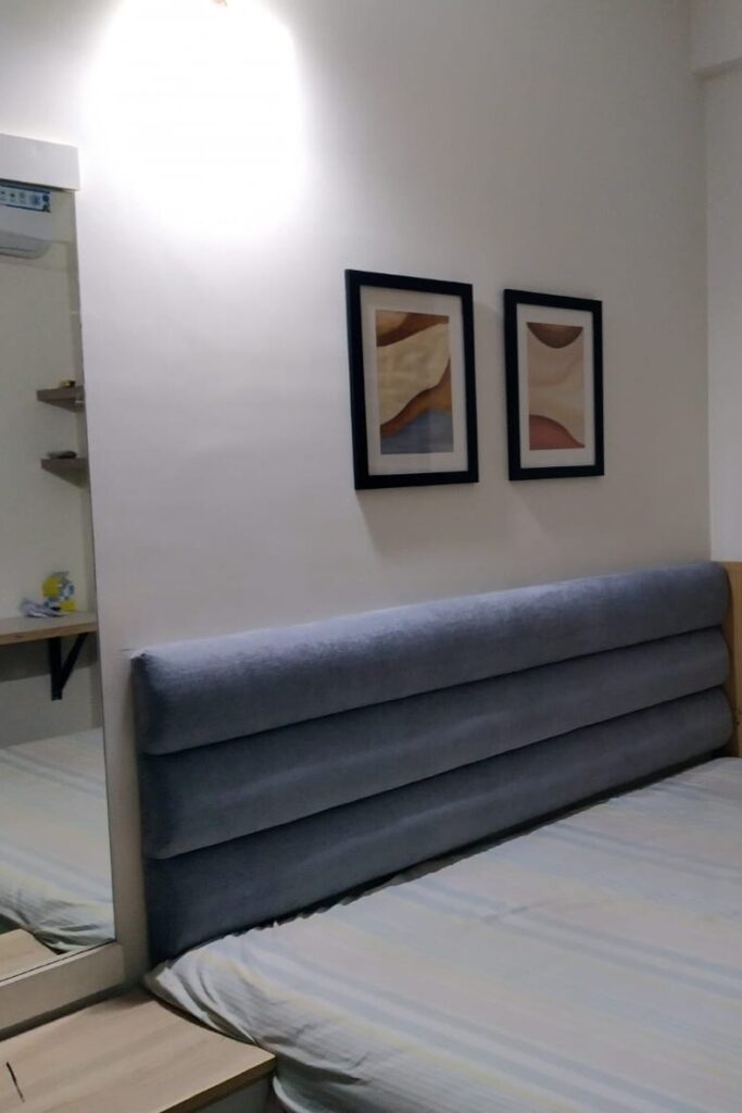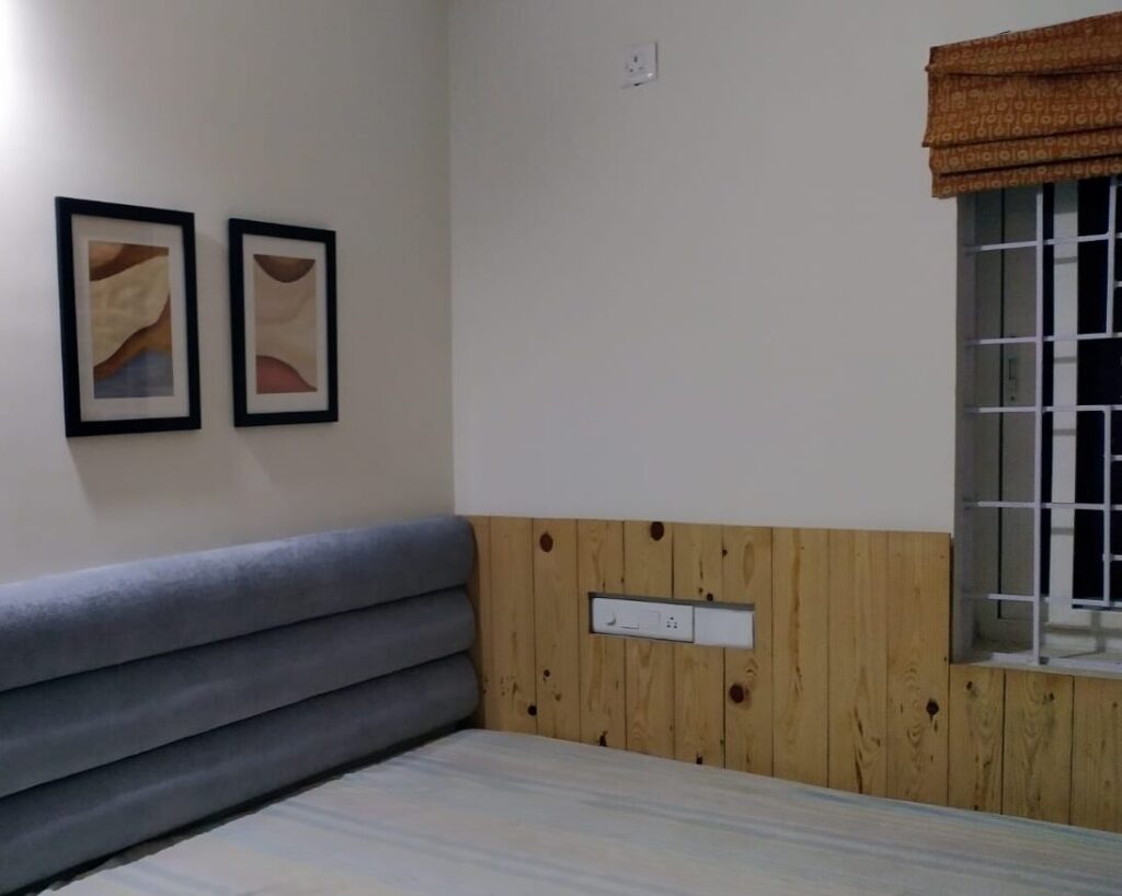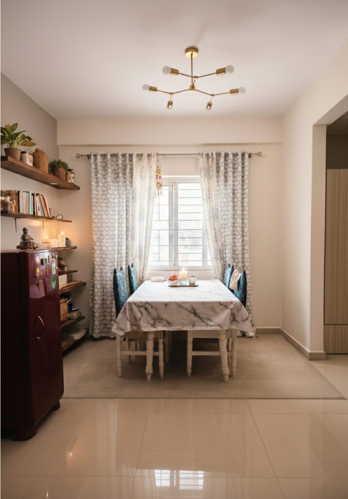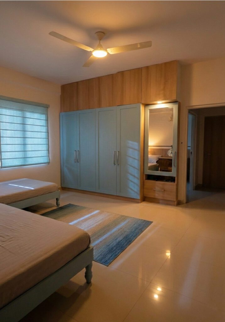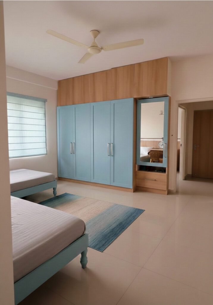In the grandmother’s room, we’ve added soft, upholstered wall-mounted headboards behind the beds and custom PU-painted wardrobes in a specific shade of sky-blue. This color choice evokes memories of her ancestral home in Andhra Pradesh, adding a personal touch to the space. The kitchen, finished again in beige with high-gloss acrylic laminate and glass shutters, includes a dedicated pooja cabinet. Ample space has been left in front of this pooja area to ensure easy access and unobstructed movement within the kitchen, balancing functionality with reverence.