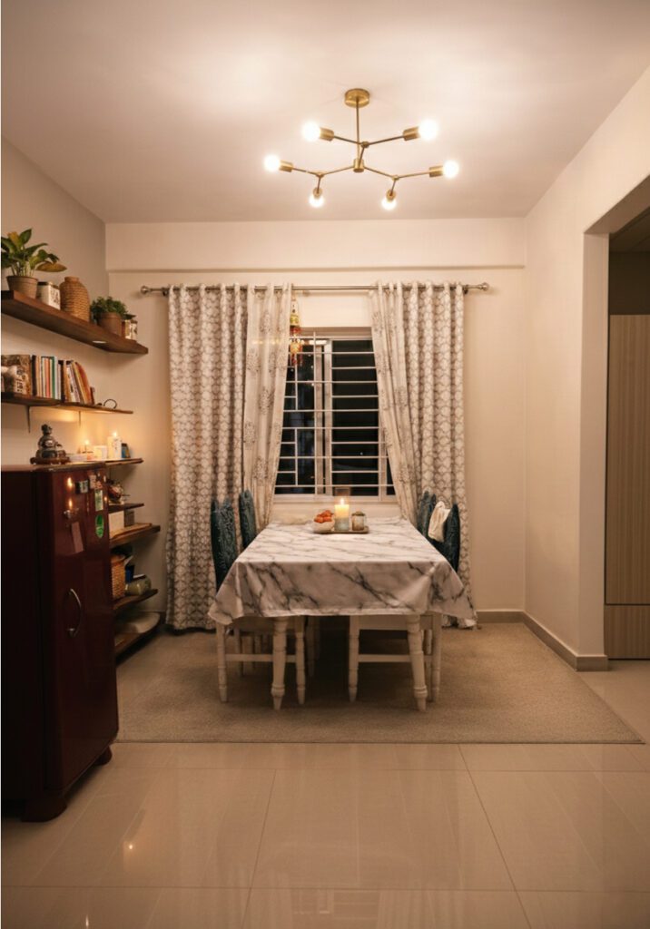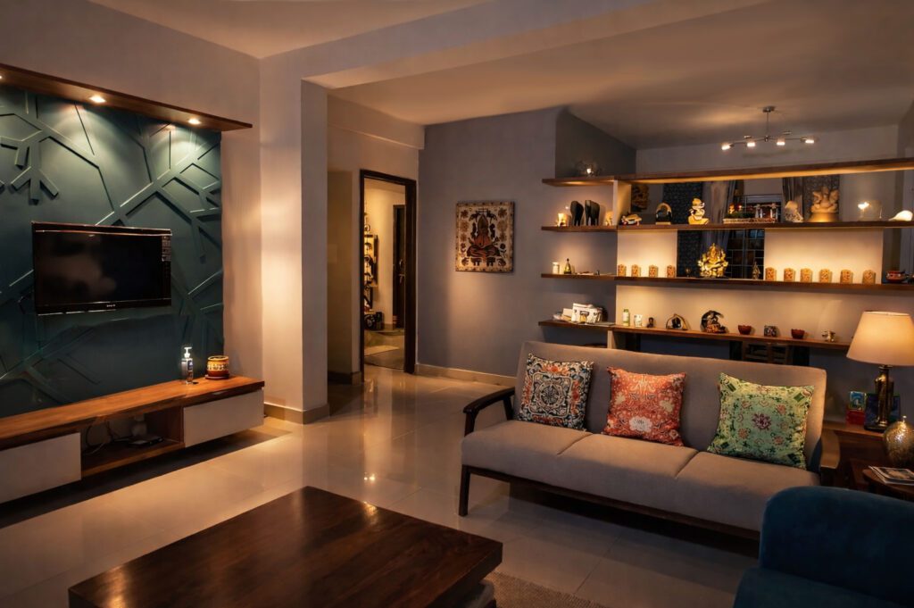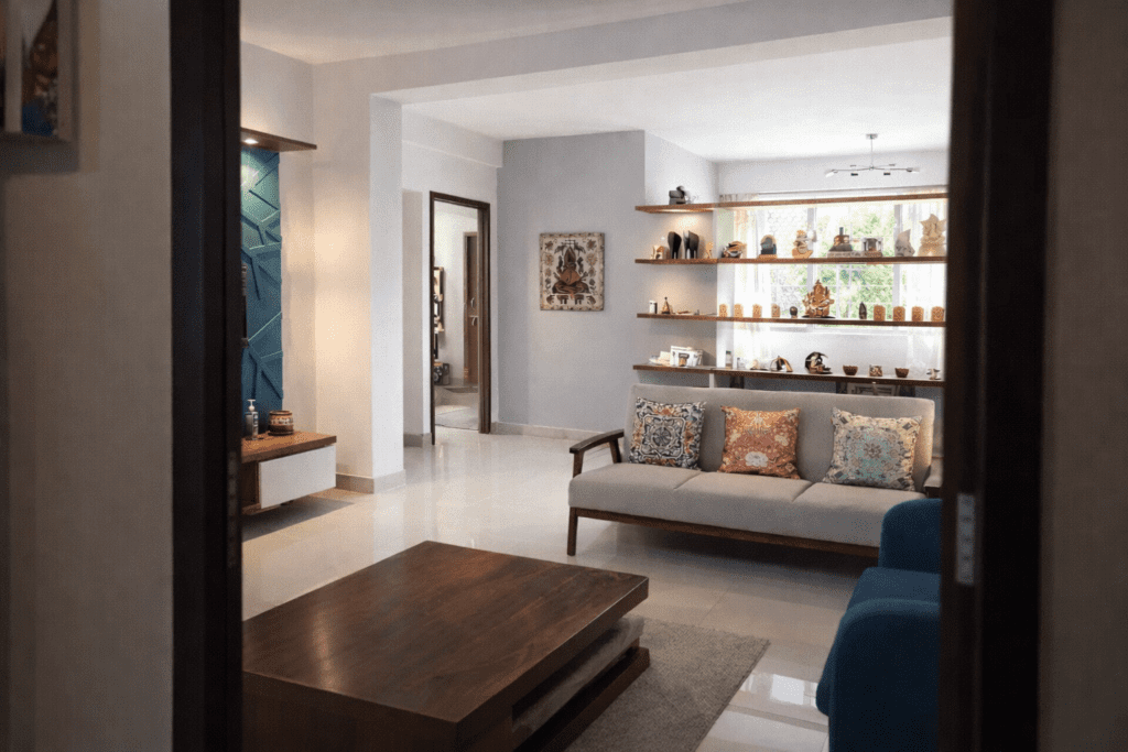 A home becomes truly unique and personalized through the belongings and cherished items of its residents. In this case, a 1600 sq. ft. flat was designed for the parents of a young NRI couple who were relocating from Hyderabad. The challenge was to accommodate their collection of knick-knacks, curios, and familiar furniture, which were so essential to their comfort that the absence of these items might leave them feeling disoriented in their new space. Each item, therefore, required a dedicated place.