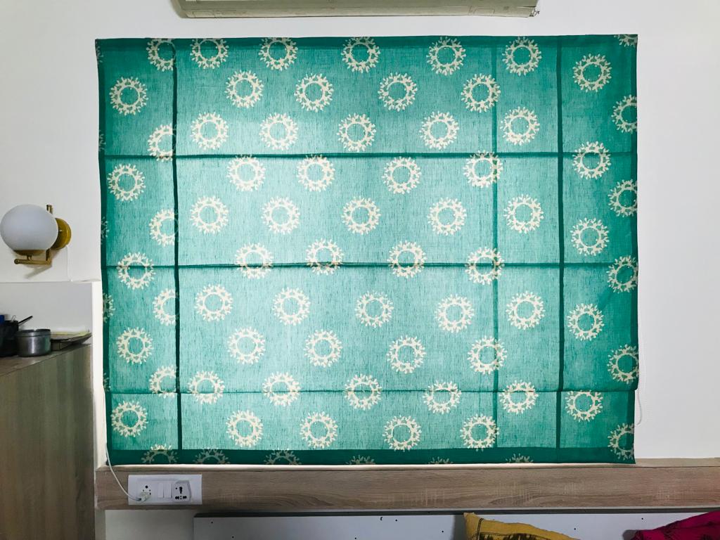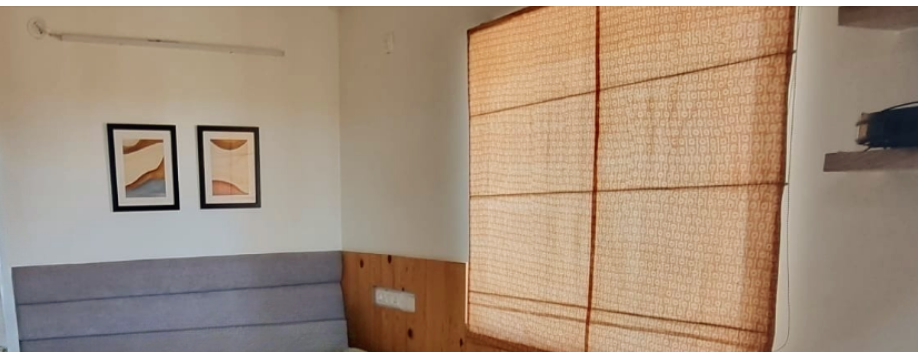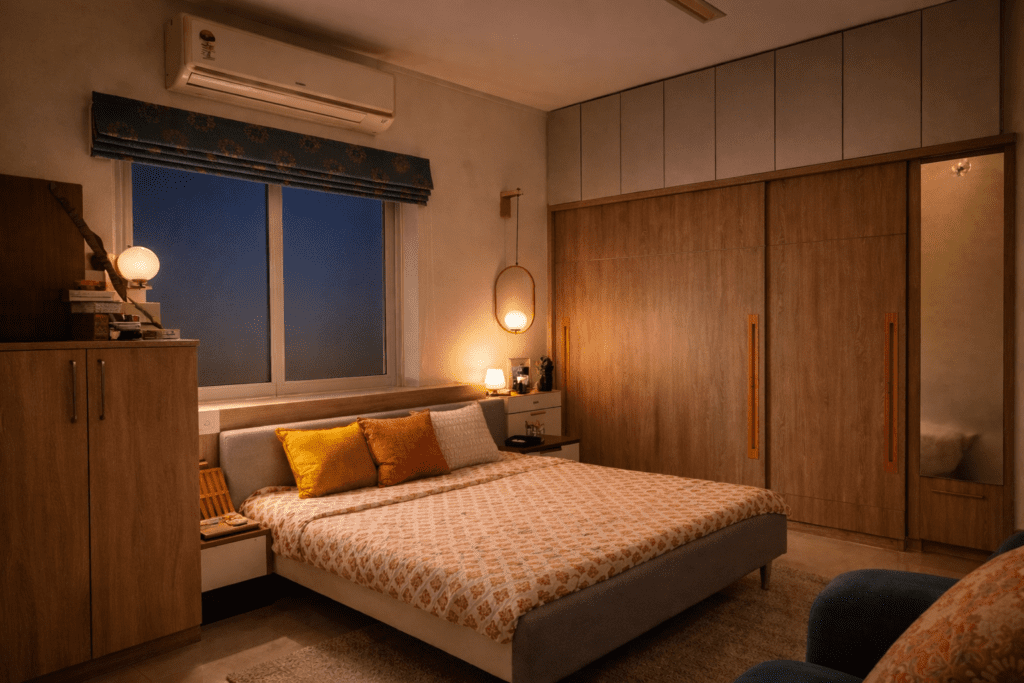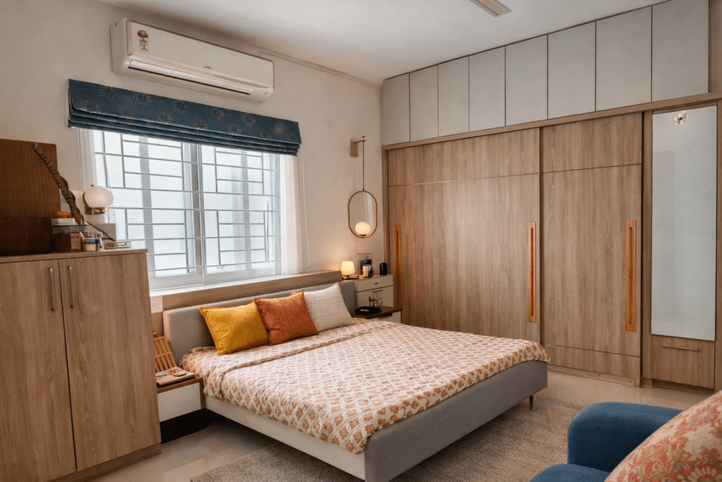 To meet this need, we designed sliding wardrobes that cleverly incorporated their Godrej store-well behind the shutters, combining functionality with style. The overall color scheme of the home is understated, featuring muted tones with vibrant accents. Splashes of color come from the TV back panel, a teal three-seater sofa, and lively cushions, rugs, and window treatments, creating a bright, airy atmosphere. Contrasting wood tones add depth and warmth, grounding the furniture and complementing the predominant neutral beige throughout the home.