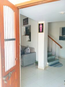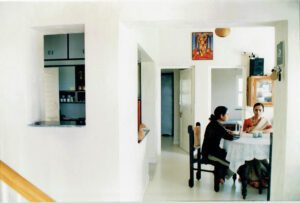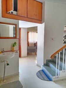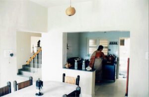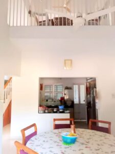Two bedrooms are located on the ground floor, along with living and dining areas that flow into one another. A double-height dining space forms the heart of the home, reinforcing its role as the primary gathering area and allowing light and air to penetrate deep into the plan.